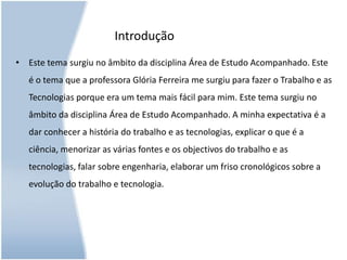 Este documento discute o tema do trabalho e das tecnologias ao longo da história. Apresenta uma introdução ao tema e objetivos. Explora a evolução do trabalho e das tecnologias desde as ferramentas primitivas até as tecnologias avançadas modernas. Discutem-se vários tipos de tecnologias como computadores, robôs, foguetes, internet e meios de transporte. Conclui-se que apesar das dificuldades de pesquisa, os objetivos do trabalho foram alcançados.