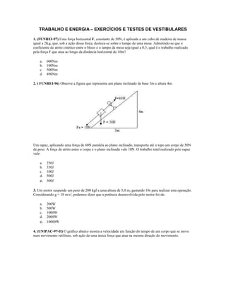 1. O documento apresenta 25 questões sobre trabalho, energia e movimento retilíneo e circular uniforme. As questões abordam conceitos como trabalho realizado por forças constantes, potência, energia cinética, energia potencial gravitacional e conservação da energia mecânica.