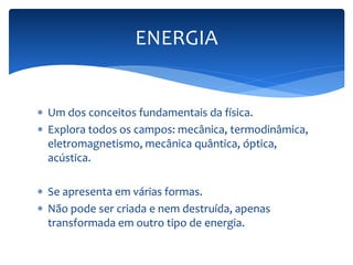 O documento discute os conceitos fundamentais de energia e trabalho na física, incluindo suas definições, unidades de medida e fórmulas. Também aborda os tipos de energia mecânica como cinética e potencial gravitacional e elástica, além de conceitos como potência, rendimento e sistemas conservativos e não-conservativos.