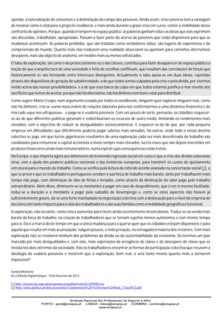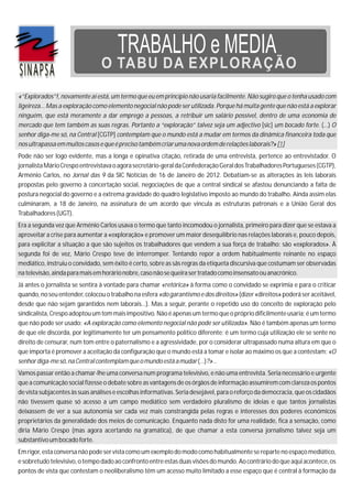 O artigo discute a exploração no trabalho e as tentativas de torná-la um tabu nos meios de comunicação. Durante uma entrevista, um jornalista repreende um sindicalista por usar o termo "exploração". O artigo argumenta que a exploração existe e está aumentando, resultando em salários mais baixos e menos direitos para os trabalhadores.