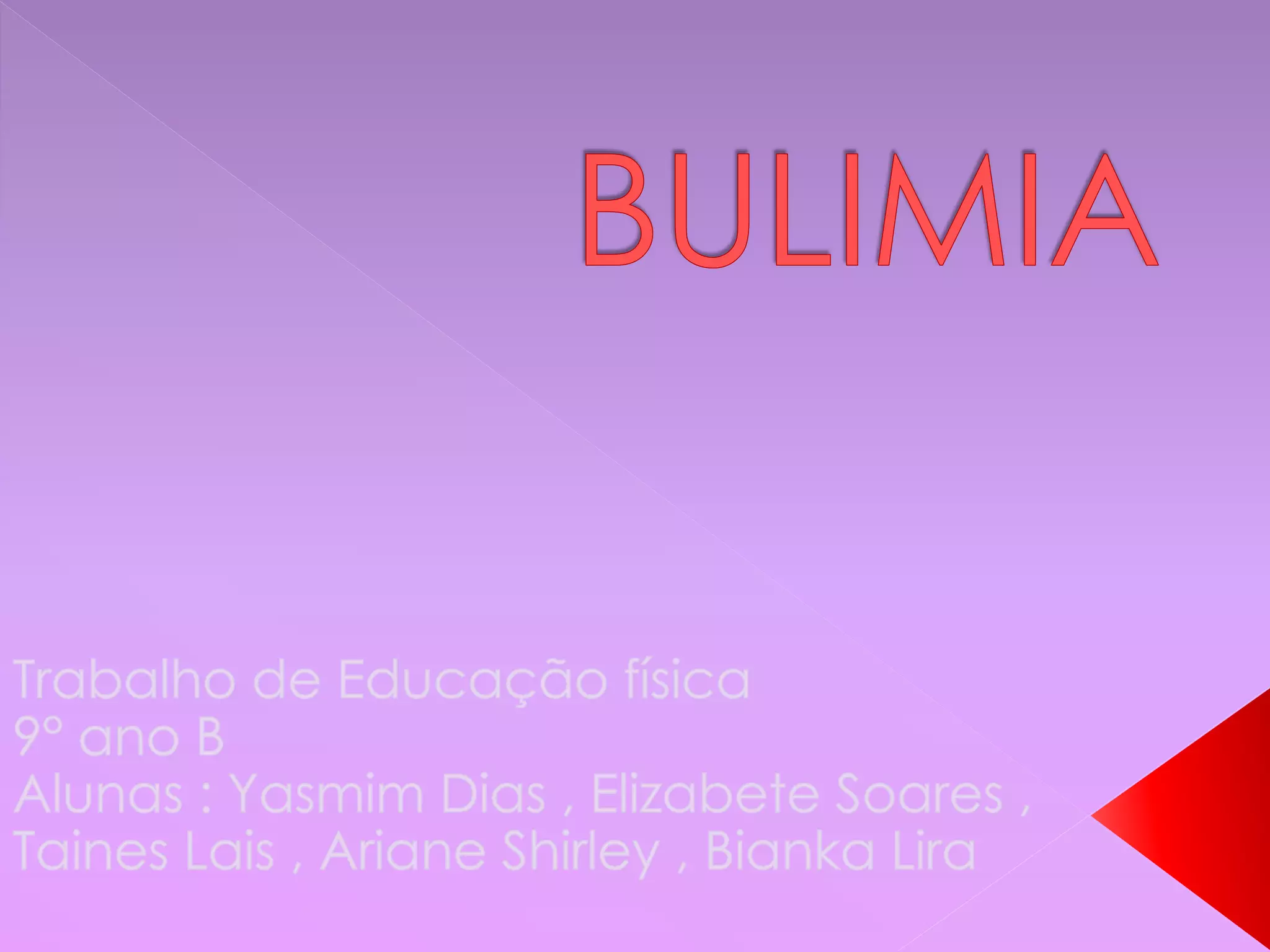 A bulimia é um distúrbio alimentar caracterizado por ingestão excessiva de alimentos calóricos seguida de vômitos ou uso de laxantes. Ela é causada por fatores como baixa autoestima, estresse e tentativa de neutralizar sofrimento, e pode levar a problemas de saúde física e mental. O tratamento envolve acompanhamento psicológico e nutricional para ajudar a desenvolver hábitos alimentares saudáveis.