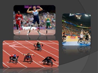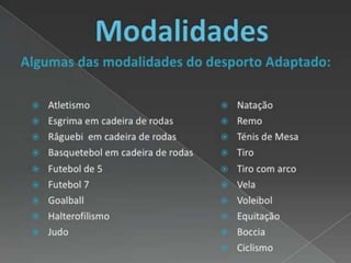 O documento discute vários aspectos do desporto paralímpico, incluindo modalidades como goalball, natação e ténis de mesa. Explica que o desporto paralímpico permite que pessoas com deficiências participem em competições desportivas organizadas.