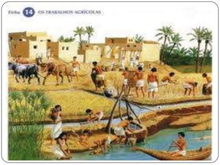 No Egito Antigo havia uma sociedade estratificada. No topo estava o faraó, considerado um deus vivo, seguido de sacerdotes, nobres e escribas. A maioria da população era composta por camponeses que trabalhavam na agricultura durante as enchentes anuais do Nilo. Outras classes incluíam soldados, artesãos e aqueles envolvidos no comércio.