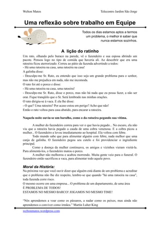 O documento conta a história de um rato que avisa outros animais sobre uma ratoeira na casa dos donos da fazenda, mas eles não se importam porque não acham que os afeta. No entanto, quando a mulher é picada por uma cobra na ratoeira e adoece, o fazendeiro mata a galinha, o porco e a vaca para alimentar as pessoas que vieram visitá-la, mostrando que os problemas de um afetam a todos. A moral é que os problemas de um departamento ou área são problemas de toda a empresa, e devemos estar un