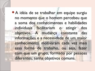 O documento discute os benefícios do trabalho em equipe e como equipes vencedoras são formadas. Ele destaca que o trabalho em equipe surgiu para facilitar o atingimento de objetivos combinando os conhecimentos de diferentes pessoas. Equipes bem-sucedidas requerem um líder forte e valores como respeito e cooperação entre os membros.