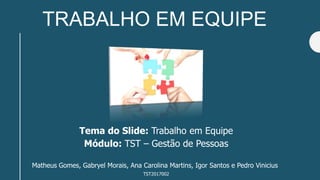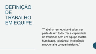 O documento discute a importância do trabalho em equipe, definindo-o como saber fazer parte de um todo com humildade, tolerância e companheirismo. Apresenta fatores essenciais como administração de conflitos e comunicação, e atitudes proibidas como criticar colegas ou desconsiderar o trabalho alheio. Conclui que o trabalho em equipe é primordial para o desenvolvimento organizacional.