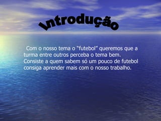 O documento descreve o esporte do futebol, incluindo suas regras, posições de jogadores, e alguns dos principais torneios e jogadores. Ele fornece detalhes sobre como o jogo é jogado, as funções do árbitro e guarda-redes, e lista os 20 principais países no ranking da FIFA.