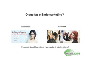 O documento discute o conceito de endomarketing, que é o esforço para alinhar a percepção dos clientes e funcionários sobre uma empresa. O objetivo do endomarketing é fazer com que a propaganda seja refletida no tratamento dos clientes pelos funcionários. O documento também lista as etapas de um projeto de endomarketing: pesquisa, planejamento e implementação.