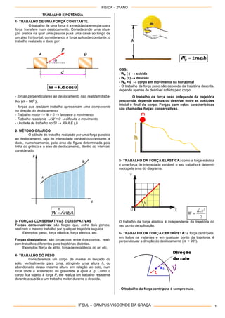 O documento discute conceitos de trabalho e potência em física. Trata de (1) cálculo de trabalho de forças constantes, (2) método gráfico para forças variáveis, e (3) diferença entre forças conservativas e dissipativas. Apresenta também exemplos como trabalho do peso e da força elástica.