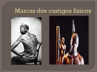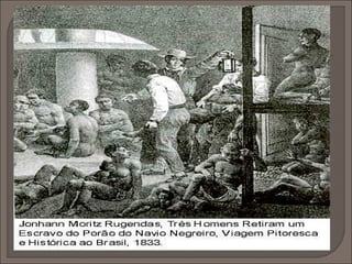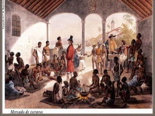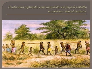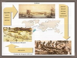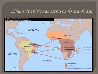 O documento descreve o tráfico de escravos entre a África, Europa e Américas durante o período colonial português. Os portugueses dominaram o comércio de escravos africanos, trazendo milhares de pessoas para o Brasil para trabalhar sob um sistema de escravidão que durou mais de 300 anos e moldou a sociedade brasileira.