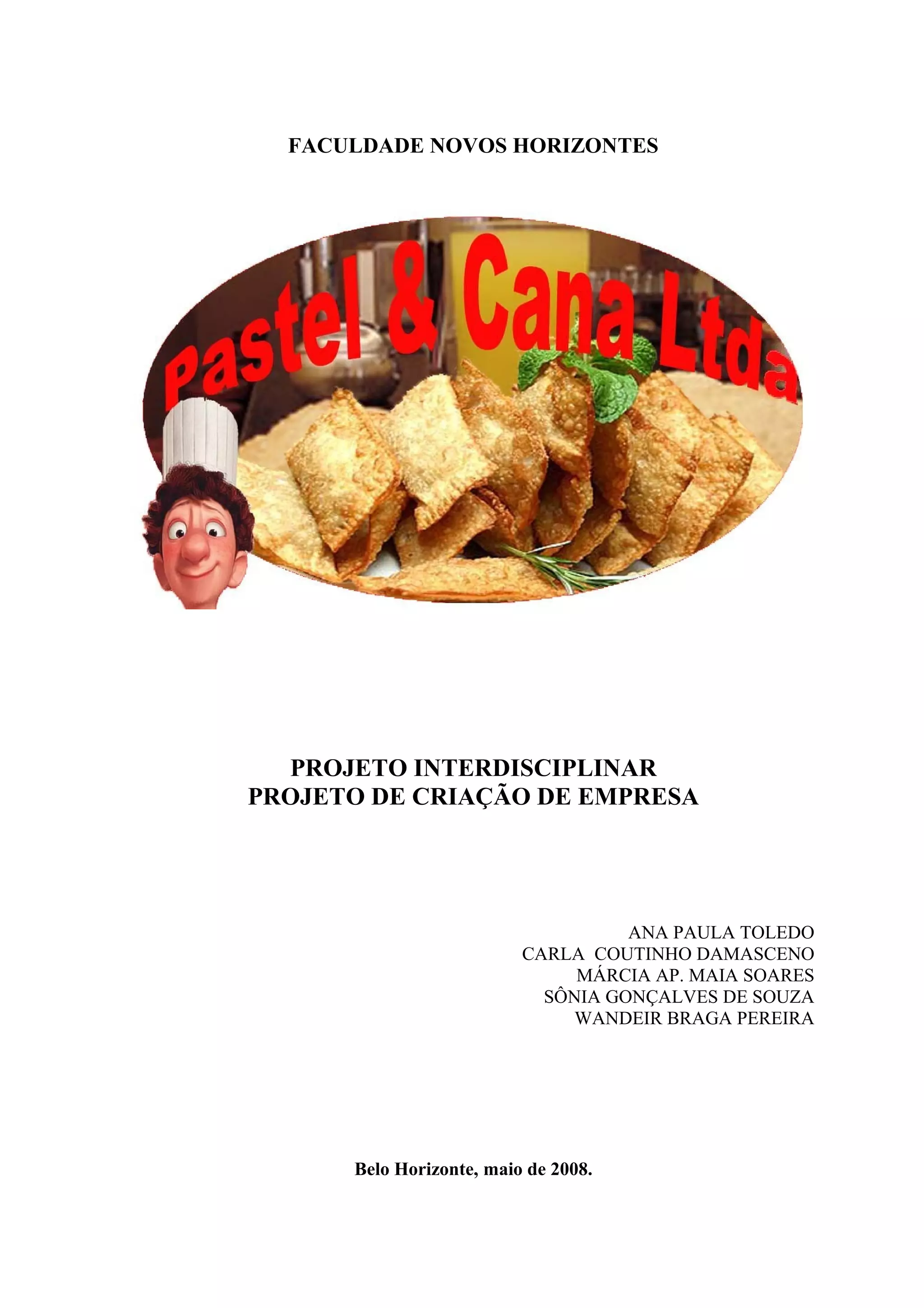 Este documento apresenta um projeto de criação de uma empresa de pastéis e sucos chamada Pastel & Cana LTDA por alunas de administração. O projeto descreve o plano de negócios incluindo uma análise de mercado, estratégias de marketing e financeiras, gestão de pessoas e operações. A empresa terá cinco sócios e será localizada no bairro Barreiro em Belo Horizonte. O projeto fornece detalhes sobre os produtos, público-alvo, concorrência, pontos de venda, estrutura organizacional,