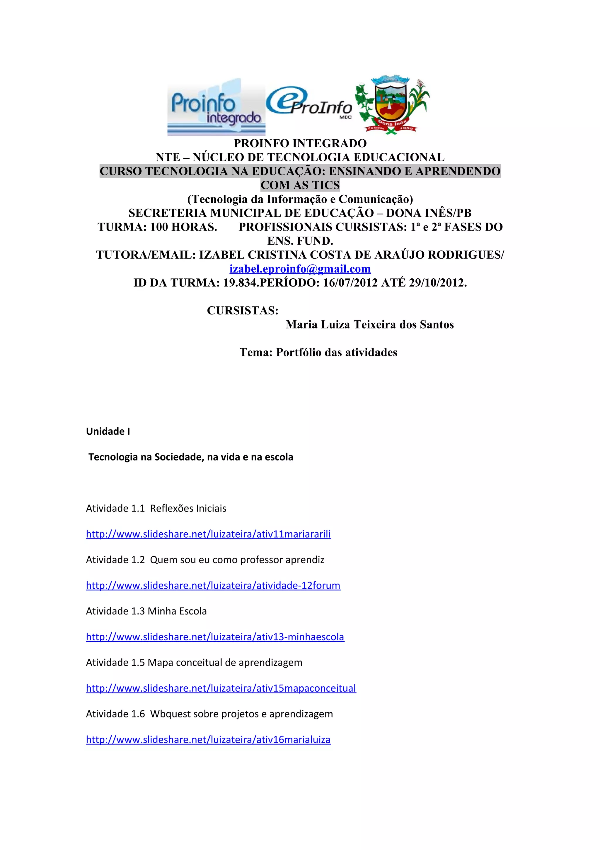 Este documento apresenta o portfólio de atividades de uma professora, Maria Luiza Teixeira dos Santos, em um curso de tecnologia educacional. O portfólio contém links para as atividades realizadas em quatro unidades do curso, cobrindo tópicos como tecnologia na sociedade e escola, internet e hipermídia, currículo e projetos, e mídias digitais. As atividades incluem reflexões, navegação na internet, mapas conceituais, planos de aula e produções multimídia