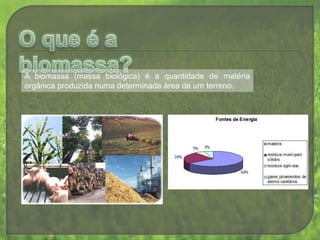 O documento discute a biomassa, que é a matéria orgânica produzida em uma área de terra. A biomassa consiste em resíduos de florestas e lixo urbano em decomposição, que podem ser convertidos em energia térmica e elétrica através da combustão ou produção de biogás. A biomassa é uma fonte renovável e limpa de energia com potencial para melhorar o meio ambiente e criar empregos, embora ainda esteja em desenvolvimento e exija mais cultivo de plantas. Portugal e a Central Termoelé