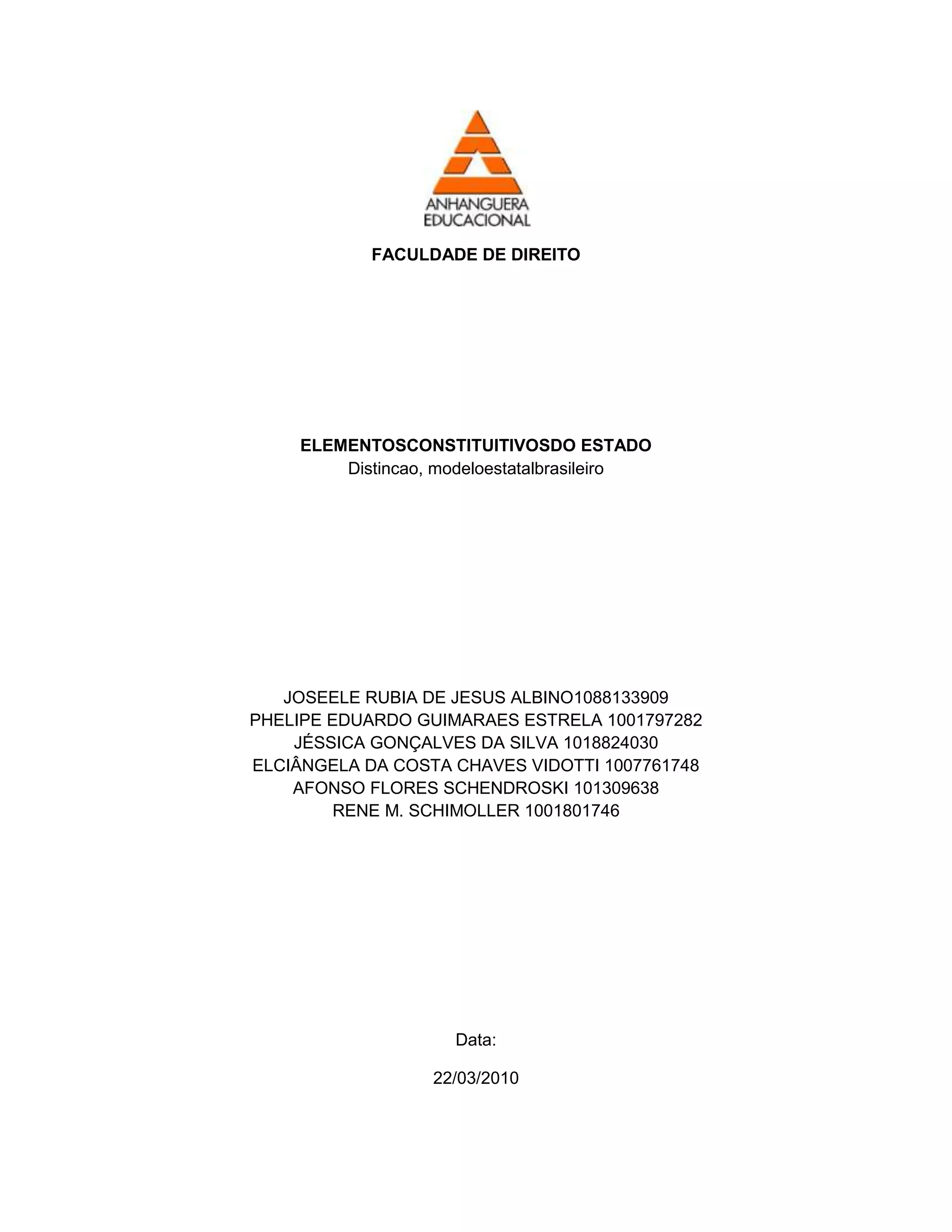O documento discute os três elementos constitutivos do Estado brasileiro segundo a Constituição de 1988: (1) o território, que inclui o solo, subsolo, espaço aéreo e águas territoriais do Brasil; (2) o povo, referindo-se aos cidadãos que detém o poder político soberano; (3) a soberania, que é exercida pelo povo por meio de seus representantes eleitos de acordo com a Constituição.