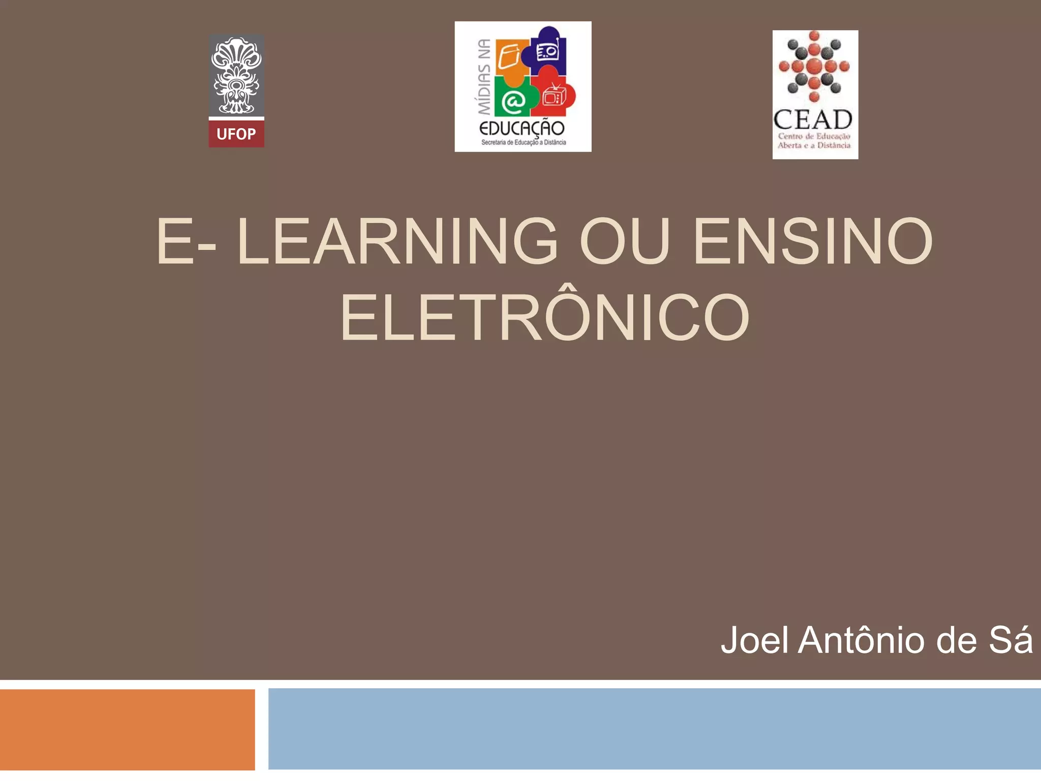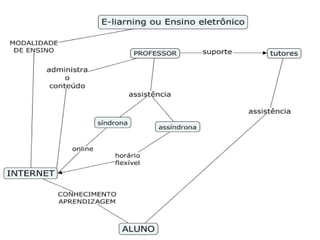 O documento define e-learning como um modelo de ensino não presencial apoiado por tecnologia, no qual os alunos aprendem através de conteúdos online com ou sem a participação de um professor, e a interatividade da internet pode facilitar a comunicação entre alunos, tutores e a mídia.