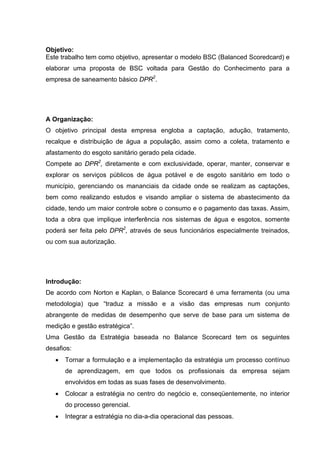 Este documento apresenta uma proposta de Balance Scorecard (BSC) para gestão do conhecimento na empresa DPR2 de saneamento básico. O BSC proposto inclui perspectivas financeira, de processos internos, de clientes e de aprendizagem e inovação, com objetivos, indicadores e ações para cada uma. O documento conclui que um BSC bem construído com informações de gestão do conhecimento terá sucesso em avaliar e corrigir estratégias.