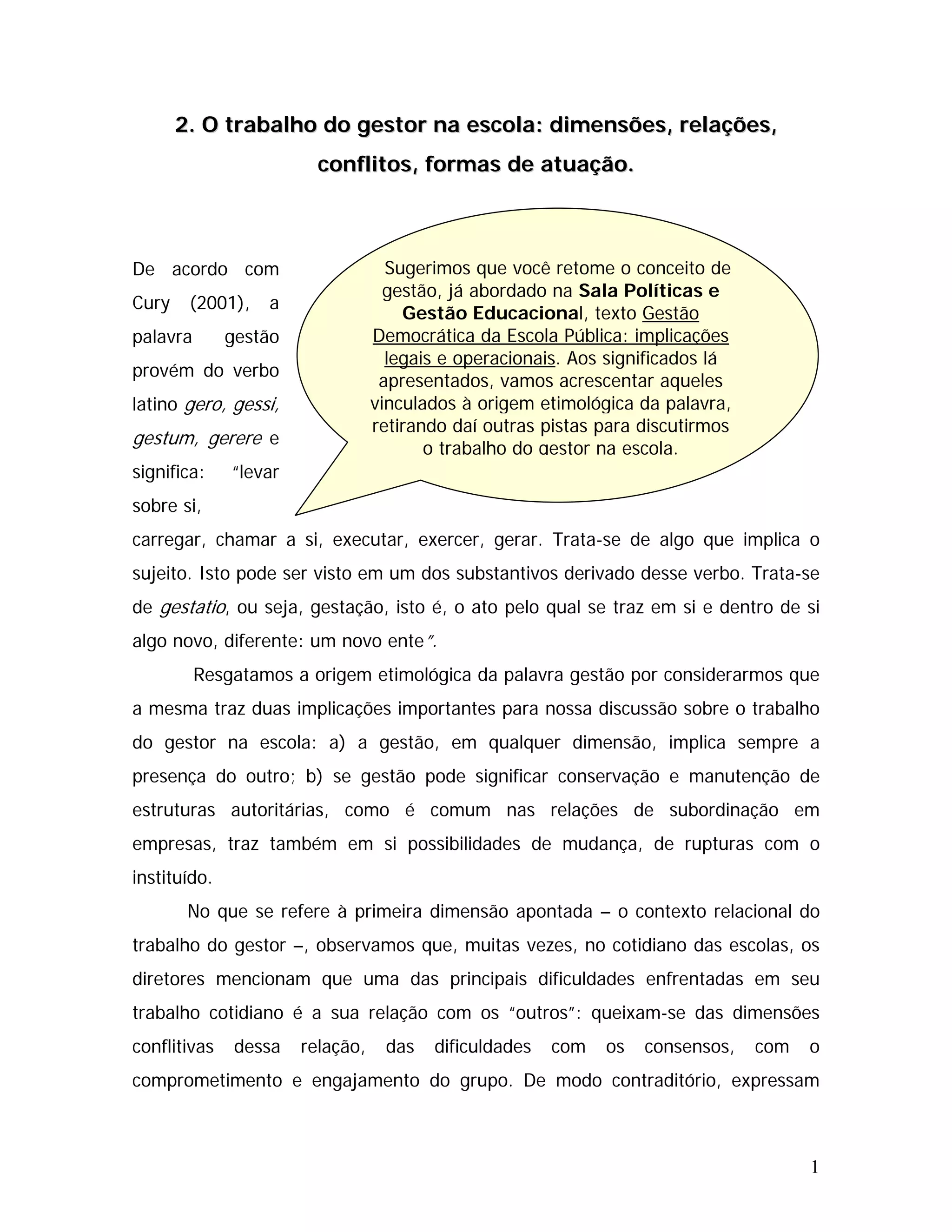 O documento discute o trabalho do gestor escolar na perspectiva da gestão democrática. Apresenta que a gestão implica a presença do outro e possibilidades de mudança. Também discute os desafios do gestor em articular a diversidade do coletivo escolar em torno de um projeto comum e as dimensões e obstáculos do trabalho do gestor.