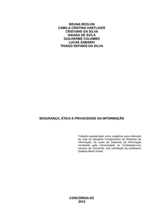 Este documento apresenta um trabalho sobre segurança, ética e privacidade da informação desenvolvido por alunos do curso de Sistemas de Informação da Universidade do Contestado. O trabalho discute conceitos como valor da informação, princípios e classificações de segurança, ameaças como hackers e programas maliciosos, e métodos para proteger a privacidade e integridade dos dados.