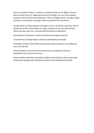 Portugal no início do século XIX ainda estava sob o Antigo Regime, com uma economia agrícola e sociedade hierarquizada. Havia uma burguesia e intelectuais que ansiavam por mudanças liberais, como os ideais da Revolução Francesa. As invasões francesas ajudaram a espalhar esses ideais. Após a revolução liberal de 1820, surgiram oposições entre absolutistas e liberais, levando a uma guerra civil de 1823 a 1824.