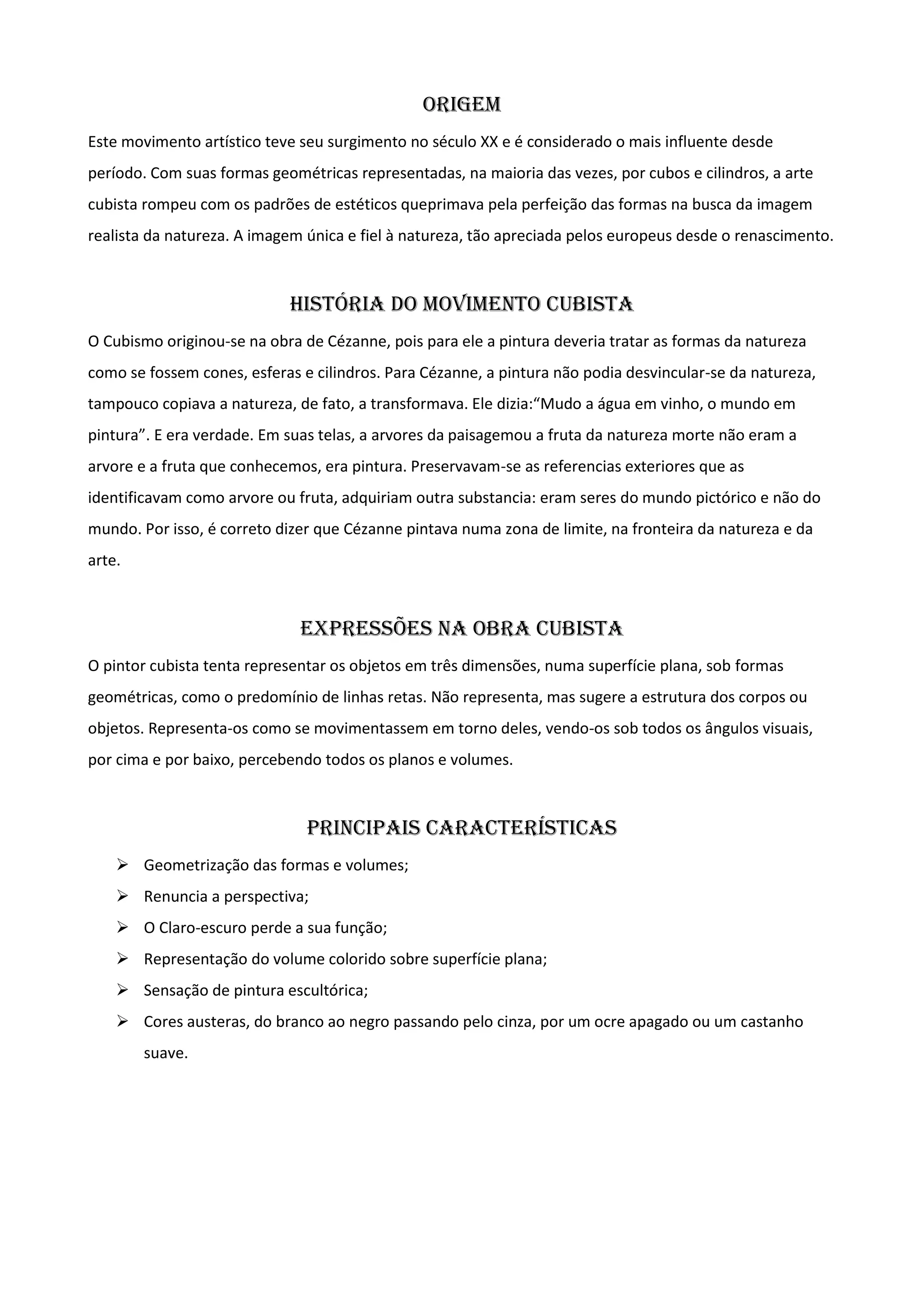 O cubismo, emergido no século XX, revolucionou a estética artística ao utilizar formas geométricas e desafiar a representação realista da natureza. Originado pelas obras de Cézanne, o cubismo se desenvolveu em duas fases principais: analítico, que fragmenta objetos em múltiplas perspectivas, e sintético, que busca reestruturar a figura através da colagem de diversos materiais e elementos. No Brasil, artistas como Tarsila do Amaral incorporaram influências cubistas, contribuindo para a arte moderna ao desenvolver novas propostas visuais.