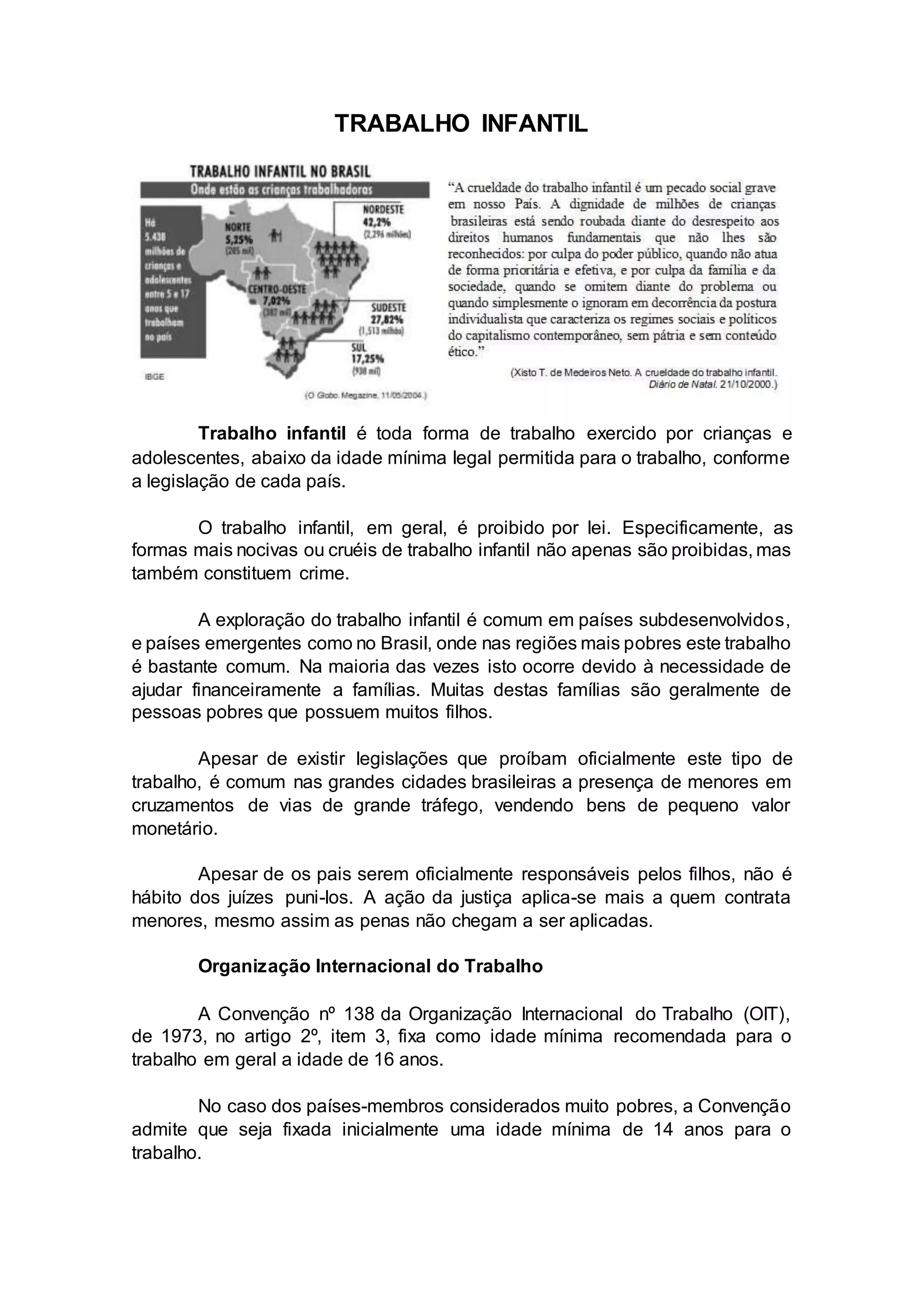 O documento discute o trabalho infantil, definindo-o como qualquer trabalho realizado por crianças abaixo da idade mínima legal. Apesar de ser proibido em muitos países, o trabalho infantil ainda é comum em regiões pobres, onde as crianças ajudam financeiramente suas famílias. Organizações como a OIT e a UNICEF trabalham para combater formas especialmente prejudiciais de trabalho infantil.