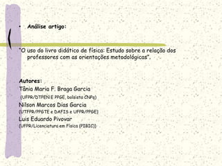 Este documento descreve uma pesquisa sobre como professores de física do ensino médio usam e se relacionam com livros didáticos de física. Os objetivos da pesquisa são analisar como os professores usam os livros didáticos para planejar aulas, entender como o conhecimento escolar é produzido a partir disso, e compreender o significado das orientações didático-metodológicas nos livros para os professores.