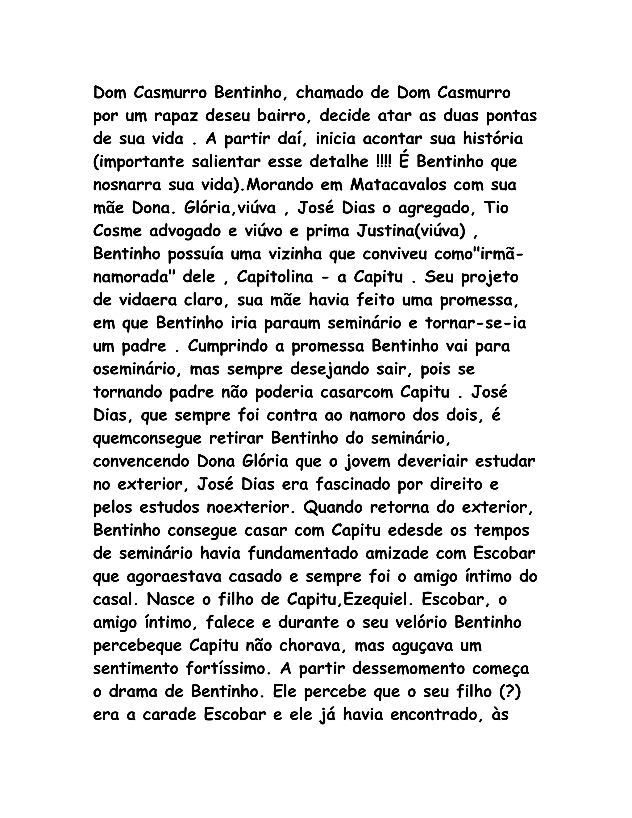 Dom Casmurro conta a história de Bentinho, que vive com sua mãe e vizinha Capitu na cidade de Matacavalos. Ele frequenta o seminário, mas sai para se casar com Capitu. Anos depois, Bentinho começa a suspeitar que Capitu e seu melhor amigo Escobar tiveram um caso, tornando duvidosa a paternidade de seu filho Ezequiel. No final, apenas a dúvida de Bentinho permanece.