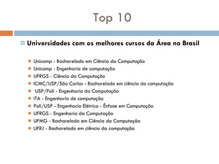 O documento lista as principais áreas da Ciência da Computação e fornece breves descrições de algumas delas, como Teoria da Computação, Banco de Dados, Sistemas de Informação. Alunos apresentam resumos sobre tópicos como Teoria da Computação, Análise de Algoritmos, Matemática da Computação e Sistemas de Informação.