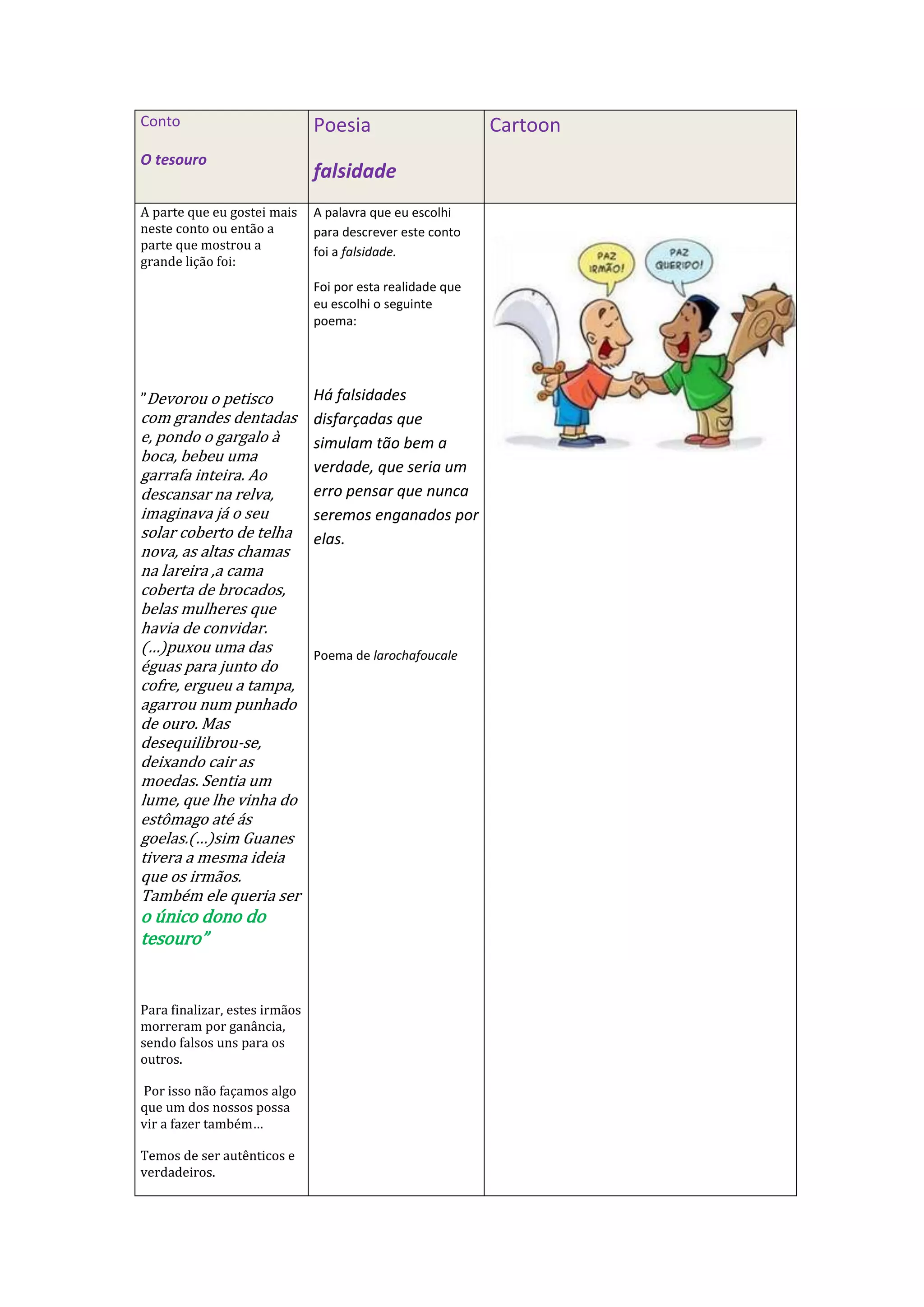 Este documento discute um conto sobre três irmãos que encontram um tesouro e se tornam desconfiados uns dos outros por ganância. No final, todos os irmãos morrem envenenados, ilustrando como a falsidade e ganância podem levar à ruína. O documento também inclui um poema sobre as falsidades disfarçadas que podem enganar as pessoas, e um cartoon sobre dois irmãos que fingem ser amigos mas na verdade são cínicos um com o outro.