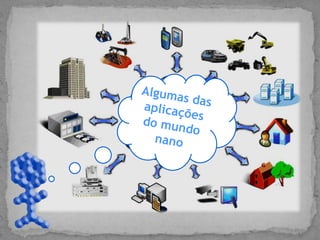 O documento discute nanoestruturas e nanotecnologia. Explica que o prefixo "nano" indica dimensões menores que 100 nanômetros e que a nanociência estuda fenômenos e manipulação de materiais nessa escala. Também descreve aplicações potenciais como sensores, máquinas e robôs nanométricos em medicina e indústrias.