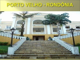 O documento fornece informações sobre a cidade de Porto Velho, localizada em Rondônia. Detalha a fundação da cidade ligada à construção da Estrada de Ferro Madeira-Mamoré e seu crescimento a partir das instalações ferroviárias. Também descreve as principais atividades econômicas, autoridades políticas e pontos turísticos da cidade.