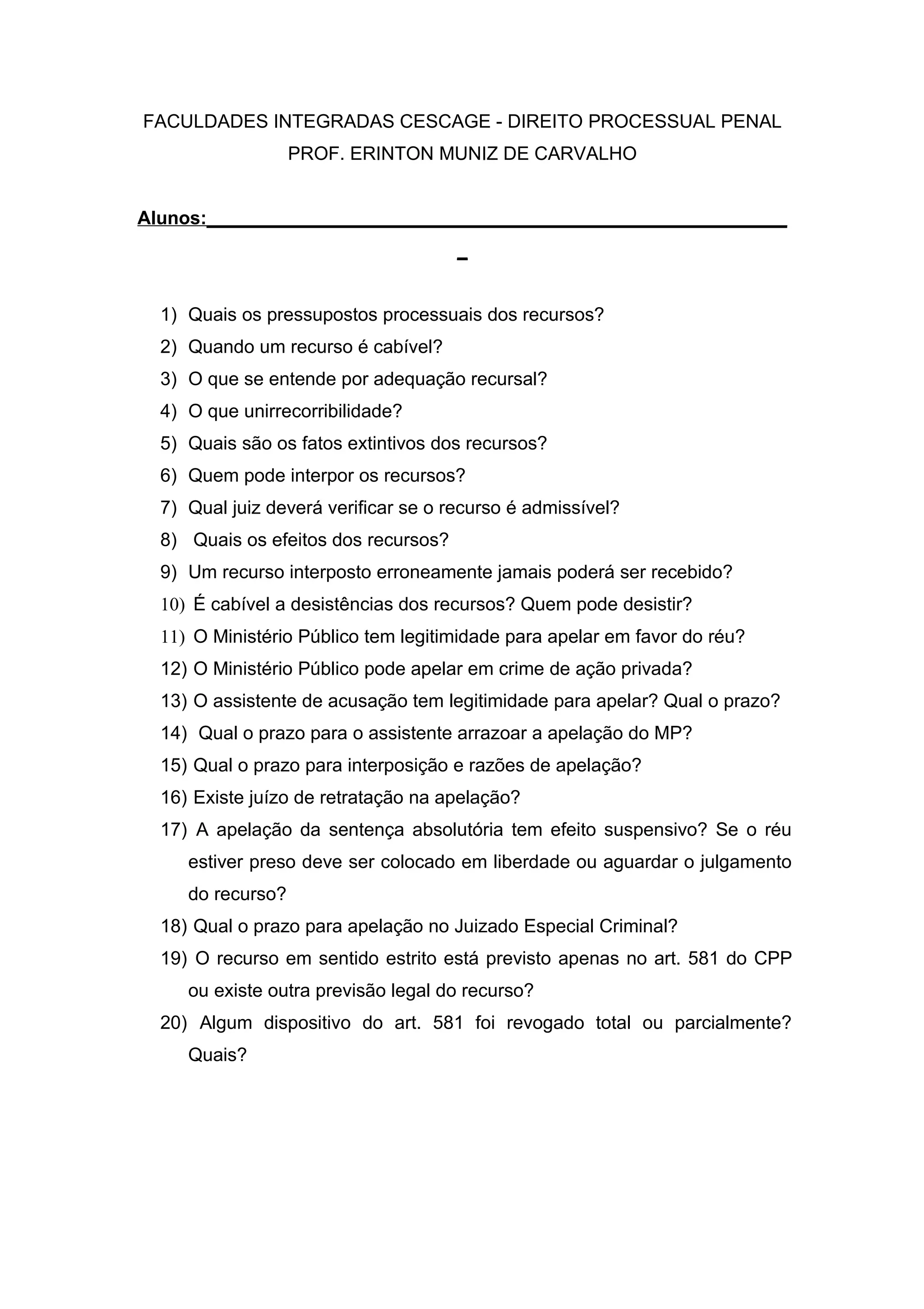 Este documento apresenta 20 perguntas sobre recursos processuais penais, incluindo seus pressupostos, cabimento, adequação, interposição, efeitos e prazos para apelação no Juizado Especial Criminal.