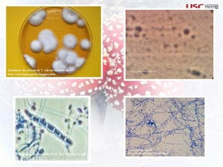 1) Trichophyton rubrum, um fungo dermatofítico cosmopolita que causa a maioria das infecções dermatofíticas humanas.