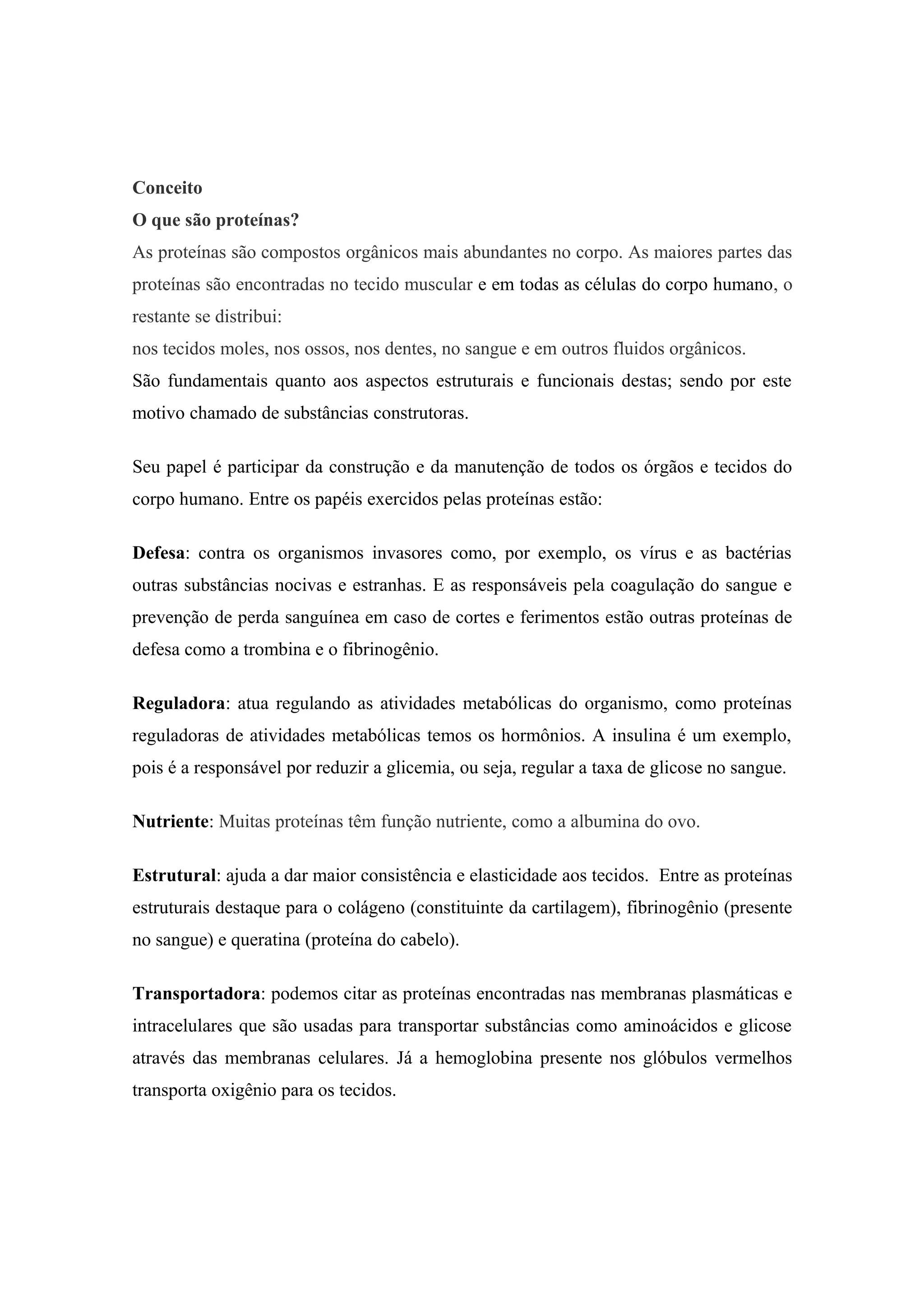 O documento descreve o que são proteínas, seus principais papéis no corpo e fontes de proteínas. As proteínas são compostos orgânicos encontrados principalmente em tecidos musculares e células, e desempenham funções estruturais, de defesa, reguladoras e enzimáticas no corpo. Alimentos como carnes, ovos, feijão e soja fornecem proteínas de alta qualidade.