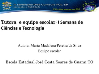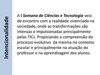 O documento descreve a primeira semana de ciências e tecnologia realizada na Escola Estadual José Costa Soares de Guaraí-TO. As turmas apresentaram pesquisas sobre tecnologia e a evolução dos computadores e mídias. O evento promoveu a troca de experiências entre alunos, professores e a comunidade e contribuiu para a aprendizagem sobre o tema.