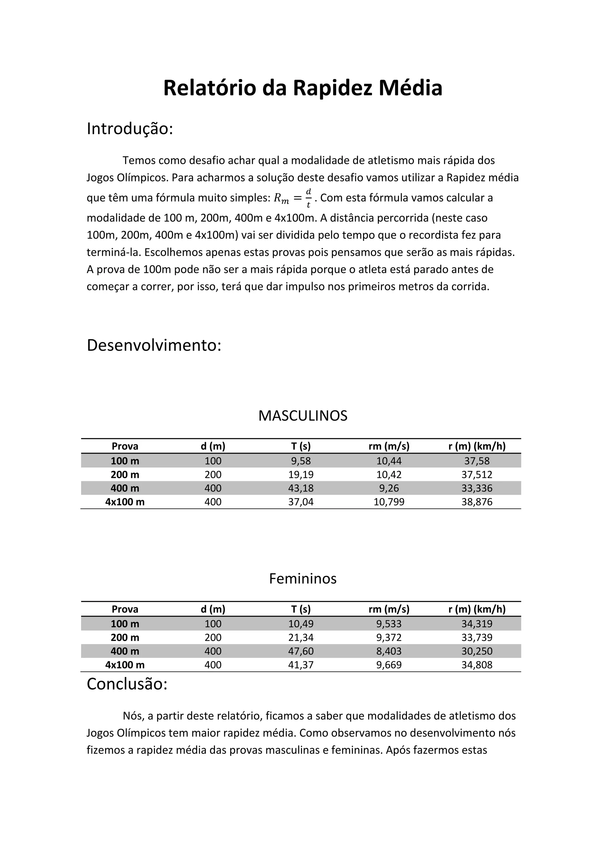 O relatório analisa a rapidez média de diferentes provas de atletismo olímpicas para homens e mulheres. As tabelas mostram que a prova masculina de 4x100m tem a maior rapidez média de 10,799 m/s ou 38,876 km/h, enquanto a prova feminina de 100m tem a menor rapidez média de 9,533 m/s ou 34,319 km/h. O relatório conclui que a prova masculina de 4x100m é a mais rápida dos Jogos Olímpicos.