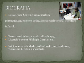 Luísa Ducla Soares é uma escritora portuguesa especializada em literatura infantil. Nasceu em 1939 em Lisboa e licenciou-se em Filologia Germânica. Trabalhou como tradutora, jornalista e diretora cultural antes de se dedicar à literatura infantil, recebendo vários prêmios por sua obra.