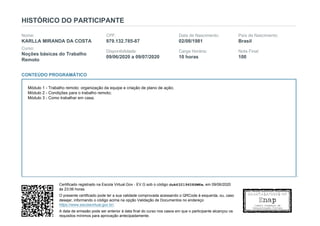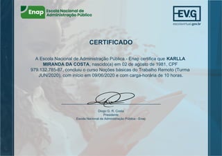 O documento é um certificado que atesta que Karlla Miranda da Costa concluiu com sucesso um curso online de 10 horas sobre Noções Básicas do Trabalho Remoto oferecido pela Escola Nacional de Administração Pública entre 9 de junho e 9 de julho de 2020, obtendo nota final de 100.