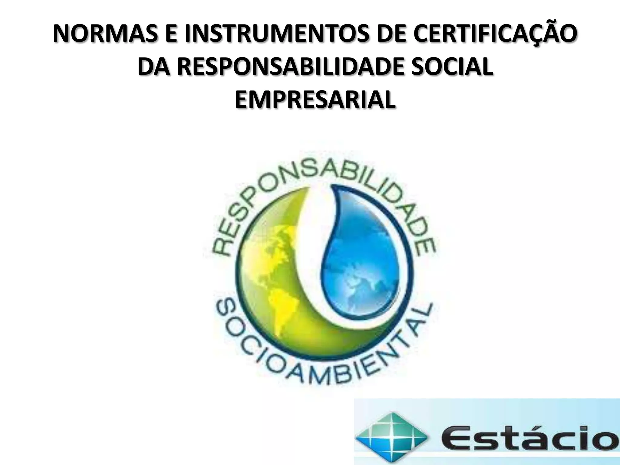 O documento apresenta os principais instrumentos e normas de certificação da responsabilidade social empresarial, como a ISO 9000 sobre gestão da qualidade, ISO 14000 sobre meio ambiente, OHSAS 18001 sobre saúde e segurança no trabalho e SA 8000 sobre responsabilidade social. A norma brasileira ABNT NBR 16001 prevê uma certificação nacional de responsabilidade social.