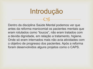 O documento discute a reforma manicomial e a criação dos Centros de Atenção Psicossocial (CAPS) no Brasil. Antes da reforma, os pacientes mentais eram rotulados e internados sem tratamento ou atividades. Após a reforma, projetos como os CAPS foram desenvolvidos para fornecer atendimento médico e psicológico na comunidade e promover a inserção social dos pacientes. Os CAPS oferecem atividades terapêuticas, comunitárias e assembleias para apoiar a autonomia e integração dos