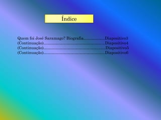 O documento fornece uma biografia do escritor português José Saramago em 6 páginas. Detalha seu local e data de nascimento, nacionalidade, ocupações, principais obras e prêmios. Descreve também sua educação, primeiros empregos e carreira literária desde a publicação de seu primeiro livro em 1947.