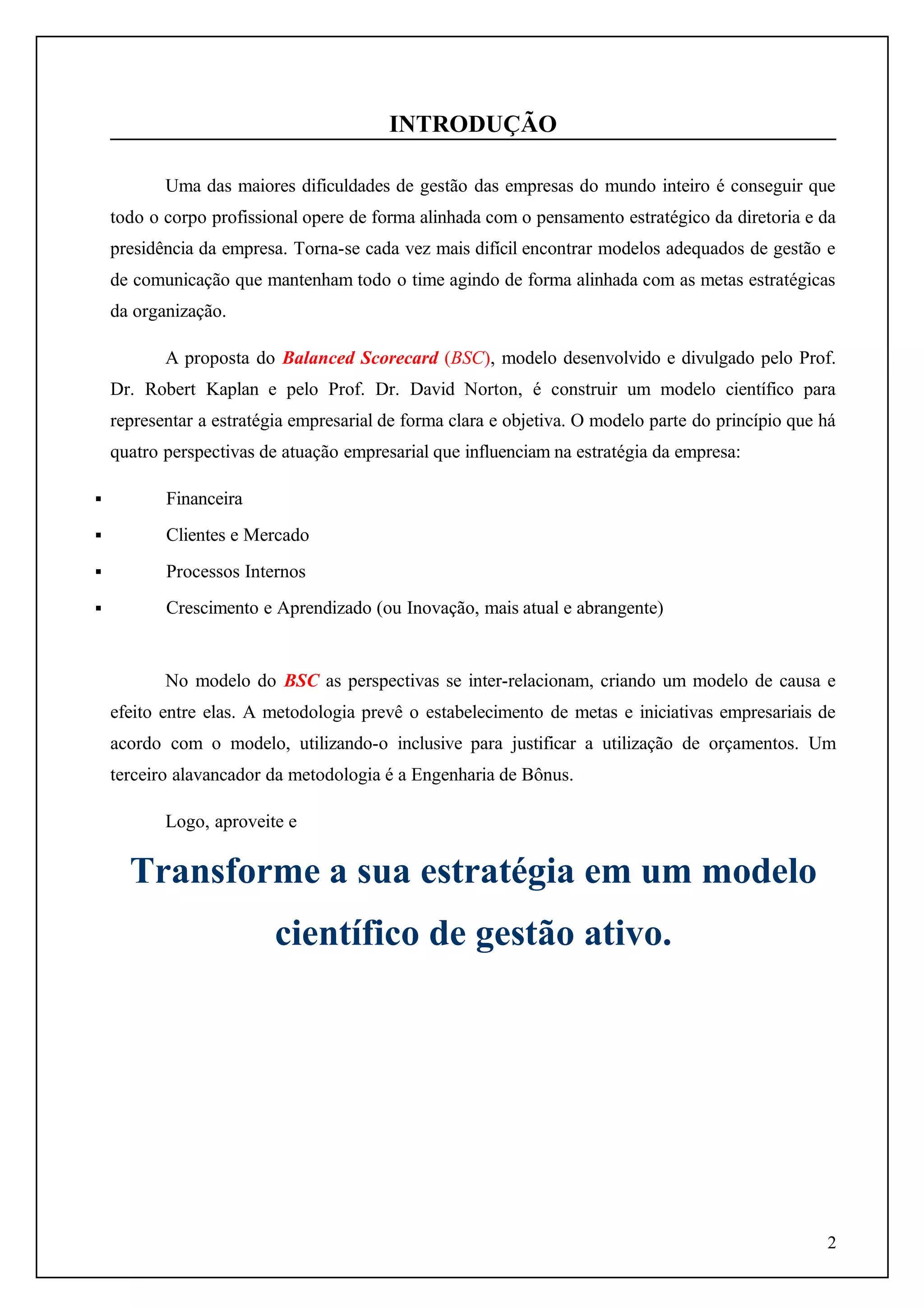 O Balanced Scorecard (BSC) é uma metodologia de gestão desenvolvida por Kaplan e Norton para alinhar a estratégia empresarial ao desempenho organizacional, utilizando quatro perspectivas: financeira, clientes, processos internos e aprendizado/crescimento. O modelo fornece uma abordagem integrada para medir e gerenciar a estratégia, permitindo a definição de metas e a justificação de orçamentos, além de facilitar a comunicação e compreensão da estratégia em todos os níveis da organização. Benefícios incluem a formação de uma visão homogênea das métricas de desempenho, compromisso dos executivos e foco no longo prazo, de forma a melhorar tanto estratégias quanto operações.