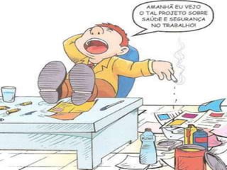 O documento discute acidentes de trabalho, incluindo acidentes típicos que ocorrem no trabalho e acidentes de trajeto entre a casa e o trabalho. Também aborda doenças ocupacionais, benefícios para vítimas de acidentes, obrigações das empresas e causas comuns de acidentes.