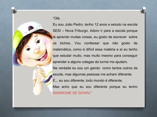 O documento descreve a experiência de um professor ao receber um aluno com Síndrome de Down em sua sala de aula. O professor fez pesquisas sobre como ensinar crianças com SD e implementou estratégias como atividades em pequenos períodos, repetição, uso de tecnologias assistivas e sensibilização dos colegas. O aluno João Pedro compartilha sua rotina escolar e paixão pelo judô.