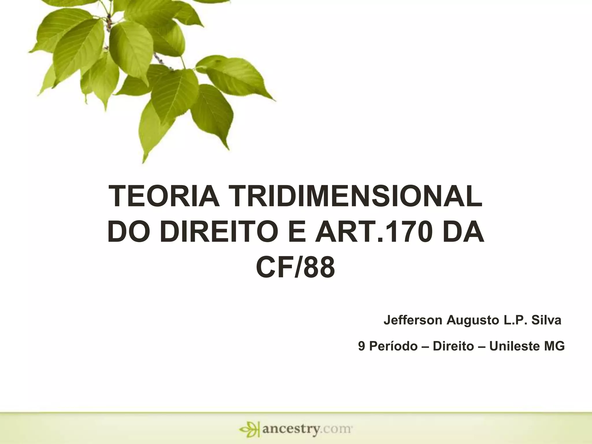 A teoria tridimensional do direito de Miguel Reale analisa o direito como tendo três dimensões interligadas: fato, valor e norma. O artigo 170 da Constituição Federal de 1988 estabelece princípios para a ordem econômica brasileira, como valorização do trabalho humano e livre iniciativa, visando a existência digna para todos de acordo com a justiça social.