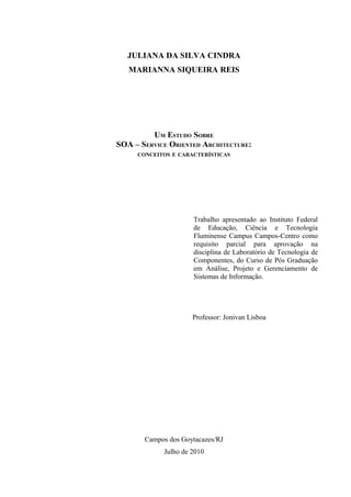 1. O documento discute os conceitos e características da Arquitetura Orientada a Serviços (SOA). 2. A SOA é definida como um estilo de arquitetura baseado em computação distribuída que permite diferentes aplicações trocarem informações. 3. Os principais conceitos discutidos incluem web services, baixo acoplamento, transparência de rede e controle de acesso.