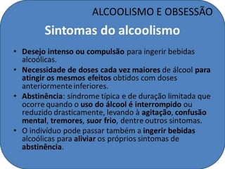 O documento discute o alcoolismo, definido como uma dependência ao álcool que pode comprometer o organismo e afetar a vida pessoal e profissional. Também aborda os efeitos do álcool no longo prazo, prejudicando órgãos como o fígado, e as consequências do abuso de álcool, como acidentes e problemas de comportamento. Por fim, explica que o alcoolismo está ligado a uma necessidade incontrolável por álcool, não à quantidade consumida.