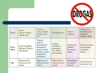 O documento discute os tipos de drogas, seus efeitos no corpo e cérebro, e os riscos do uso e dependência. Ele explica que as drogas podem ser classificadas em depressores, estimulantes e perturbadores e descreve os efeitos do álcool, crack, solventes, cocaína e maconha. Também alerta que a dependência química é difícil de tratar e que a prevenção é a melhor estratégia.