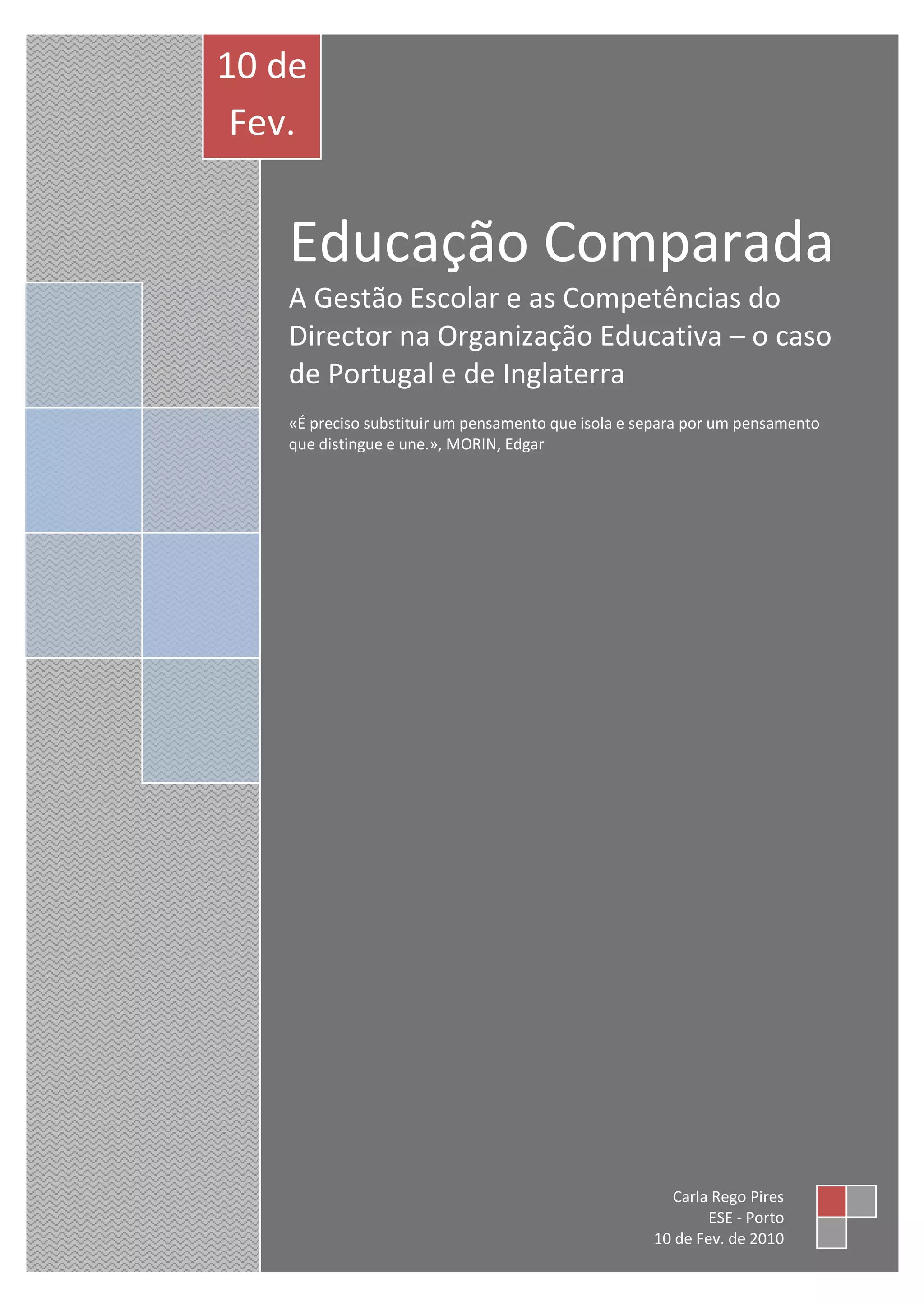Este documento discute a gestão escolar e as competências dos diretores em Portugal e Inglaterra. Primeiro, define o conceito de educação comparada e sua necessidade. Em seguida, descreve o método da educação comparada e analisa as políticas de gestão escolar e o papel do diretor em cada país. Por fim, conclui comparando as abordagens de Portugal e Inglaterra à gestão e direção escolar.