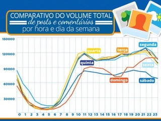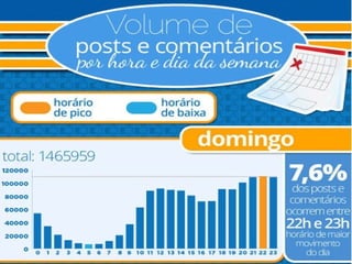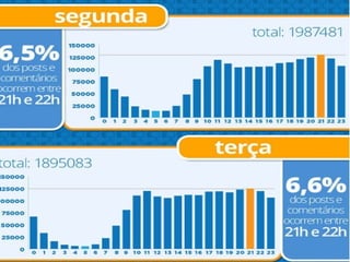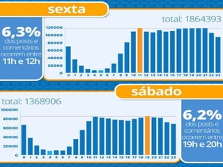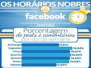 O documento descreve o crescimento do Facebook desde sua criação em 2004 até se tornar a maior rede social do mundo em 2012, com 750 milhões de usuários. Também apresenta como empresas usam o Facebook para anúncios, entretenimento e engajamento com clientes através de aplicativos, jogos e propagandas criativas.